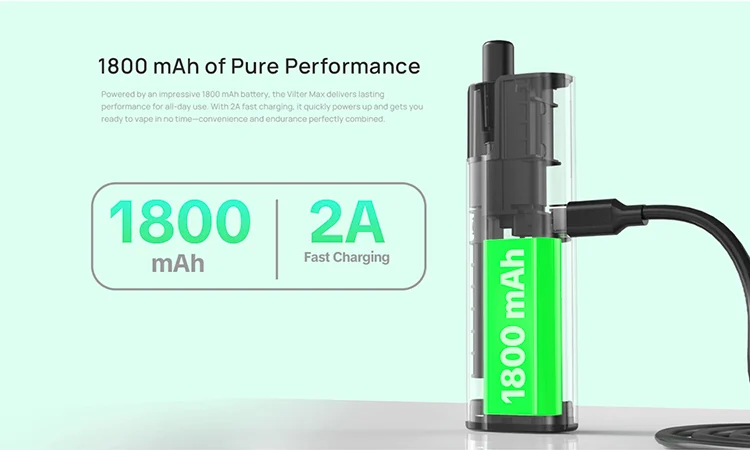 Das Ass im Ärmel: 1800 mAh. Je nach Dampfverhalten kommst du damit locker über längere Strecken – und das Laden geht über USB-C (5 V / 2 A) angenehm flott.