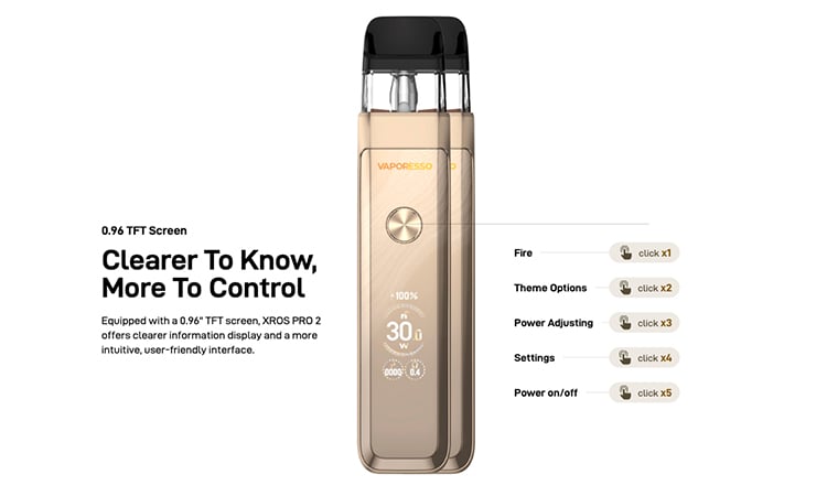 Die Leistung lässt sich zwischen 5 – 30 Watt einstellen, perfekt, um deinen persönlichen Dampf-Favorit zu finden. Kombiniert mit dem stufenlos regulierbaren Airflow hast du die Wahl zwischen straffem MTL oder luftigem RDL. Der Xros Pro 2 spielt beide Modi souverän.